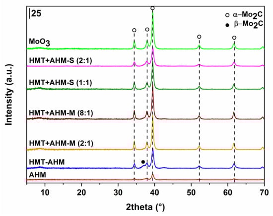 The main purpose of this study is to gain an understanding of the influence of various preparation methods of a precursor on its final physical, chemical, and textural characteristics. Wang et al. [44] have already presented two basic preparation methods. In the first, authors followed the method reported by Afanasiev [43] and obtained Mo2C, while in the second, they used mechanically mixed AHM and HMT with a molar ratio of 1:4 with obtaining metallic Mo and MoO2. The researchers also described an impact of different parameters in hydrogen thermal treatment preparation of HMT and AHM, namely, AHM:HMT molar ratios, temperature, or heating rates [44]. They reported that pure Mo2C was obtained when the molar ratio of precursors AHM and HMT reached 1:4, and nitride, carbide, and carbonitride composite materials were obtained when the molar ratio was 1:2. They showed that Mo2N became a major product phase at a lower temperature (500 °C), and for Mo2C a higher temperature (650 °C) was needed.