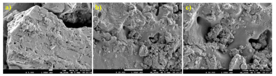 Microphotographs of the samples at 25× magnification: (a) HMT-AHM-700, (b) HMT+AHM-M (8:1), and (c) HMT+AHM-S (2:1).