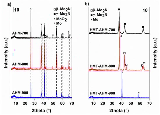 In a number of studies, molybdenum nitride and carbide have been prepared by a thermal treatment of single-source precursors. It is a simple and effective method to obtain Mo2C or Mo2N using only hexamethylenetetramine (HMT) as a reducing agent and a carbon or nitrogen source [8,43,44,45,46]. Afanasiev [43] studied the thermal decomposition of a precursor synthesized by reacting HMT with AHM. The resultant HMT-AHM precursor complex [(HMT)2(NH4)4 Mo7O24•2H2O] was decomposed under an argon atmosphere in the temperature range 550–800 °C. Using this method, crystalline Mo2N was synthesized at the temperature higher than 650 °C, while Wang et al. [45] obtained β-Mo2C by mixing HMT with HMT-AHM at the 7:1 molar ratio and at 700 °C in an argon atmosphere.