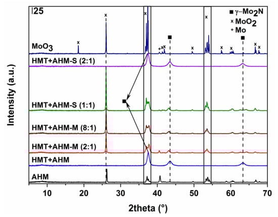 The use of the AHM precursor (Figure 10a) did not lead to the formation of molybdenum nitride; only traces of tetragonal β-Mo2N modification, the cubic phase of metallic molybdenum, and monoclinic MoO2 started to occur at 700 °C. Higher temperatures resulted in metal molybdenum and MoO2. Nitridation of HMT-AHM (Figure 10b) gave a cubic modification of γ-Mo2N accompanied by a small α-Mo2C fraction at 700 °C. Formation of β-Mo2N was observed at 800 °C and only metallic molybdenum was formed at 900 °C. The sample prepared from the HMT+AHM-S (2:1) precursor at 700 °C was cubic Mo3N2 with a small amount of α-Mo2C. The other precursors examined by XRD (Figure 11) produced a mixture of β-Mo2N with MoO2, in the case of the precursor HMT+AHM-S (1:1) (the mixture with a small proportion of metal molybdenum). An exception was for the previously mentioned HMT+AHM-S (2:1), where cubic Mo3N2 was formed with a small proportion of α-Mo2C. The MoO3 precursor was only partially reduced to MoO2 and produced a very small proportion of metallic molybdenum.