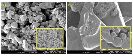 Optical and electron micrographs did not show any noticeable difference between molybdenum carbide and nitride samples (Figure 12 and Figure 13). Nitridation of HMT-AHM and HMT+AHM-S (2:1) precursor complexes also resulted in a very crystalline product, while HMT+AHM-M produced a microcrystalline product (Figure 12). The sponge structure was also typical for these materials (Figure 13), but was more distinct and produced labyrinths in comparison to carbides, where relatively small isolated circular pores were observed. When the HMT+AHM-S (1:1) precursor was used, a mixture of two different phases was observed (Figure 14a). A crystalline phase was composed of tugarinovite (MoO2) and sponge phases consisted of β-Mo2N phases. The same crystalline phase was observed when using the MoO3 precursor (Figure 14b).