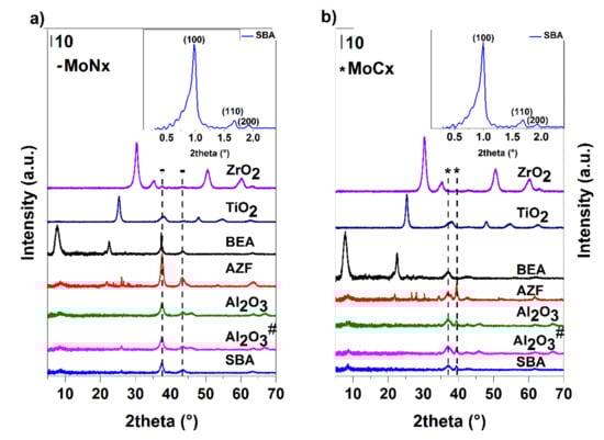 XRD results (Figure 16) showed that when Al2O3 was used as the support, well-dispersed carbides and nitrides phases were formed. In carbides samples, apart from α-Mo2C and Al2O3, the main phase was detected as amorphous. The nitrides, besides the main amorphous phase, also contained β-Mo2N accompanied by cubic Mo3N2 and Al2O3. In addition, the formation of a certain proportion of a cubic AlN phase cannot be excluded. The phase composition of MoCx on Al2O3# and Al2O3 was identical, but in the case of MoNx, the samples differed by predominant monoclinic MoO2 on Al2O3#. The synthesis of Al2O3# supported materials is more often used than the method with precursor complexes due to its simplicity [51,52,53]. However, in the case of nitrides, there was no complete conversion to the desired phase in these conditions. TiO2, in the case of carbide preparation, comprised the crystalline phase of anatase accompanied by the well-dispersed carbide phase containing α-Mo2C and β-Mo2C in the ratio of 40:60. The possible formation of a small fraction of the cubic delta phase cannot be excluded. The nitride pathway led the β-Mo2N phase accompanied by cubic Mo3N2. The dominant crystalline phase was anatase. A shift of the peak at about 38° 2 theta to the right can be explained as a partial overlapping of the carbide/nitride peak with the anatase phase of the support. A similar composition of the active phases was observed on ZrO2, which due to the small pore volume, contained only about half of the amount of molybdenum against the TiO2 support. The proportion of the carbide phases was identical, whereas, for nitrides, it was not possible to exclude the presence of the gamma phase. At the carbide pathway, the SBA-15 mesoporous silica provided a mixture of α-Mo2C and β-Mo2C at a ratio of about 40:60; in the case of the nitride pathway, there was a cubic Mo3N4 and a part of the monoclinic MoO2. The diffractogram, when measuring low angles, shows that the mesoporous structure was preserved (Figure 16). The obtained diffractograms also show the presence of reflections characteristic of microporous zeolite Beta and well-dispersed β-Mo2C and cubic Mo3N2 of carbide and nitride samples, respectively. Diffractograms of the samples prepared on AZF support show the presence of the zeolite phase (clinoptilolite) and crystalline α-Mo2C and β-Mo2C (approximately 60:40) and β-Mo2N, respectively. The influence of the support acidity on the formation of carbide or nitride phases was not clear. On the more acidic supports, in the case of carbides, a mixture of α- and β- phases was produced, while in the mixed nitride phase, the crystalline cubic phase of Mo3N2 was observed.