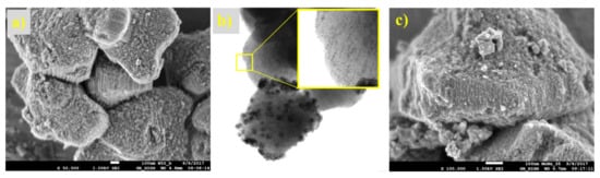 The microphotographs from the optical and electron microscope (Figure 17 and Figure 18) show the structure of the prepared supported samples. The composite samples on AZF had macroporous cavities filled with crystalline carbides (Figure 17). The porous structure did not change, even after heat treatment at 700 °C. On the detailed SEM image, a sponge-like structure with a large number of small pores is clearly visible. The samples prepared on the SBA-15 support are shown in Figure 18. A regular structure of the mesoporous silica SBA-15 was not disordered during the preparation of the carbides or nitrides, even at 700 °C. Its surface was formed by nitride or carbide crystals, probably shaped by precursor leakage from the cylindrical pores during heat treatment. The TEM image of carbided SBA-15 (Figure 18b) clearly shows in detail the basic mesoporous structure of SBA-15 that contained the MoCx nanocrystals inside the cylindrical pores and outside on the catalyst surface. Moreover, the dramatic decrease in the surface area of SBA-15 was confirmed by TEM, as the blockage caused by the formation of crystals inside the long cylindrical mesoporous structure of the support (Figure 18b).