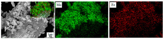 SEM images with energy-dispersive spectroscopy (EDS) analysis of the mechanically alloyed Mo-Fe powder.