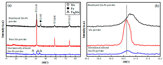 Figure 4 shows XRD patterns of the different Mo-containing powders. The patterns could be indexed to well-crystalline Mo (JCPDS No. 42-1120, marked by white squares) and Fe (JCPDS No. 89-7194, marked by black squares). It is also shown that the diffraction peaks (110) of molybdenum for the prealloyed Mo-Fe powder and mechanically alloyed Mo-Fe powder shifted to a large angle, which may have been caused by the diffusion of iron to molybdenum [20,21]. The prealloyed process caused a greater diffusion of Fe, and the mechanically alloyed process caused a partial diffusion of iron, which could have made diffusion bonding of small molybdenum powder to iron. During mechanical alloying, same ferromolybdenum compounds were generated and diffraction peaks of the Fe3Mo phase, marked by white triangles, are found in the XRD patterns.