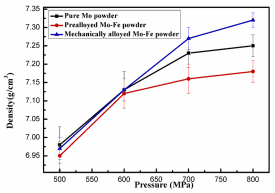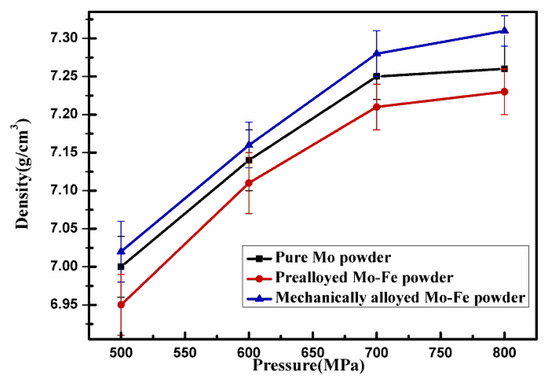 Figure 5 shows the green density of Fe-2Cu-2Mo-0.8C compacts by warm pressing the powder mixtures added with different forms of Mo at a pressure of 500–800 MPa and a temperature of 120 °C. The theoretical density of the Fe-2Cu-2Mo-0.8C samples was 7.78 g/cm3. It was obvious that the powder mixtures containing mechanically alloyed Mo-Fe powder had the highest compressibility, and a maximum green density of 7.32 g/cm3 was obtained at a compaction pressure of 800 MPa. The green density from powder mixtures added with pure Mo powder and the prealloyed Mo-Fe powder was 7.25 g/cm3 and 7.18 g/cm3 at the same pressure, respectively. Figure 5 shows that the addition form of the Mo powder also had a great influence on the compressibility of the Fe-2Cu-2Mo-0.8C powder mixtures. When molybdenum was introduced in the forms of pure Mo and prealloyed Mo-Fe powder, the powder mixtures had low plasticity and were easy to aggregate, which resulted in the low green density of the powder compacts. However, when molybdenum was introduced in the forms of mechanically alloyed Mo-Fe, the powder kept the compressibility of the reduced iron powder and fine molybdenum powder, which stuck to the surfaces of iron powder. So the powder mixtures containing mechanically alloyed Mo-Fe powder had flowability and higher compressibility.
