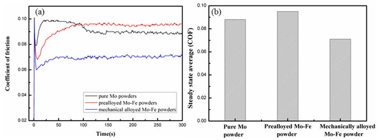 The influence of the Mo addition forms on coefficient of friction (COF) is shown in Figure 9a and the corresponding steady-state coefficient of friction is shown in Figure 9b. Due to the different microstructural features, and the hardness and strength values, the samples added with varied Mo addition forms showed a different friction behavior in the wear test. The samples containing prealloyed Mo-Fe powder had the highest COF value (0.095) and the wear rate was 9.72 × 10−4 mm3∙N−1∙m−1 while the samples with mechanical alloyed Mo-Fe powder showed the lowest COF (0.071) and the wear rate was 7.52 × 10−4 mm3∙N−1∙m−1, which took the shortest time to reach the wear stability stage.