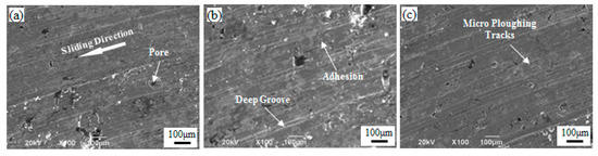 Figure 10 shows the worn surfaces of the sintered Fe-2Cu-2Mo-0.8C samples added with different forms of Mo. Figure 10a shows the worn surface of the sintered Fe-2Cu-2Mo-0.8C samples added with pure Mo powder, which exhibited some pores and deep grooves parallel to the sliding direction. The SEM image of the sintered samples added with mechanically alloyed Mo-Fe powder exhibited a smooth surface with some micro plowing tracks on the worn surface (Figure 10c). The above features demonstrated that the wear resistance behavior was supported by a higher density and uniform microstructure support. Compared with pure Mo and mechanical alloyed Mo-Fe powder, due to a low density and non-uniform structure (Figure 10b), some deep grooves could be seen in the wear test of the sintered samples added with prealloyed Mo-Fe powder. This was not likely to be retained for a longer time/distance to protect the surface from wear.