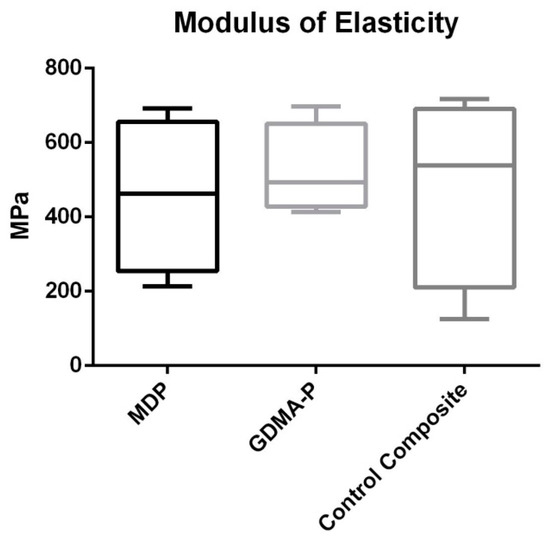 In spite of reducing the degree of conversion, MDP undertakes intermolecular interactions by Van der Waals forces, increasing internal cross-links and improving mechanical properties [17,18]. The mechanical strength of orthodontic composites is essential in order to aid dissipation of forces during the mechanics of orthodontic treatment. In the present investigation, the flexural strength outcomes (Figure 2) showed that the acidic functional monomers did not interfere with flexural strength. A feasible explanation for this is related to the intermolecular cross-links promoted by MDP and the higher di-methacrylate cross-linking obtained by adding GDMA-P, which is a dimethacrylate [19,20]. Both could have compensated for the lower degree of conversion of experimental composites.