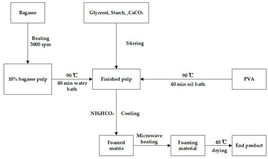 Some bagasse pulp board was immersed in water for about 2 h and then beat for 3000 rpm after spalling; then, some bagasse was placed into a sealed bag at 90 °C, placed in a water bath for 40 min, and kneaded every 10 min. A certain amount of PVA was put into a round bottom beaker and heated in a 90 °C thermostatic heating magnetic stirrer (DF-101S, Gongyi Yuhua Instrument Co., Ltd., Zhengzhou, China) for 40 min until completely dissolved. A small amount of starch was mixed with water with a ratio of 1:3 and stirred constantly in a water bath at 70 °C until it started gelatinizing. The bagasse pulp was mixed with PVA solution and stirred uniformly, then glycerin, calcium carbonate, borax, and starch solution were added. A certain amount of NH4HCO3 was added after mixing well. When all were mixed uniformly, the obtained mixture was poured into the mold and heated for a certain time in a microwave oven (M1-L213B, Guangdong Midea Electric Co., Ltd., Guangzhou, China) using 700 W power. Finally, the foam materials were obtained after drying for 12 h when the temperature of the drying oven was set to 40 °C. The specific foaming process is shown in Figure 1.
