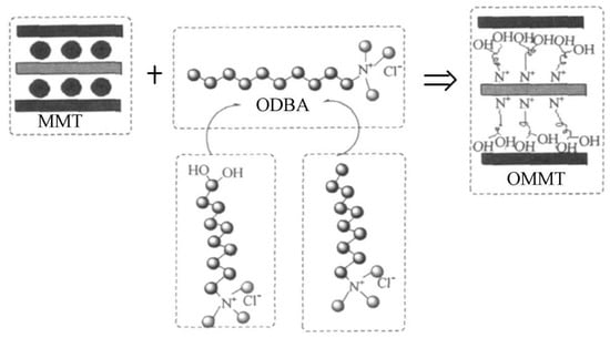 The intercalation method was used in this experiment. It was an important method for preparing polymer/inorganic nanocomposites. Many inorganic compounds, such as silicate clay, phosphates, graphite, metal oxides, disulfides, and phosphorus trisulfide complexes, have a typical layered structure and can be embedded in organic matter. The intercalation method is simple in terms of process and rich and inexpensive in terms of raw materials. The usage of the intercalation polymerization method can improve the mechanical properties of materials reduce costs, and the laminar structure and interface development of MMT can increase the porosity and hygroscopicity of fibers [,]. In this experiment, an organic quaternary ammonium intercalation agent [] was used to modify natural MMT, in order to improve the adsorption of MMT on cellulose and chemical additives. The reaction mechanism is shown in Figure 2. The methods for MMT modification included cation exchange reactions, silane grafting, and polar polymer adsorption []. In this work, the cationic long carbon chain of the organic quaternary ammonium salt was inserted and covered between the layers of the natural MMT by the ion exchange reaction.