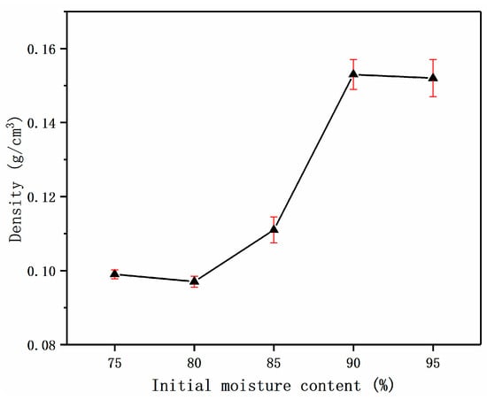 The foaming ratio depended not only on the decomposition of the foaming agent but also on the evaporation of water. The initial moisture content of the material directly affects the foaming ratio. The material with high initial moisture content had a higher volume before foaming, which resulted in a decrease in the volume ratio, before and after foaming. In addition, the rapid gasification of water molecules broke through the bubbles, causing the bubbles to rupture and the foam materials to collapse. Therefore, the different initial moisture contents were obtained by adjusting the proportion of water in the total material. The density of the foam materials with different initial moisture contents was calculated by weighing the mass of the foamed material and measuring the volume multiple times by the vernier caliper. In the end, the effect of initial moisture content on the foaming density of the material was explored. The results are as follows.