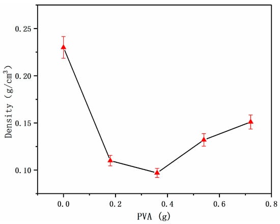 It can be seen from Figure 4 that the density of the foam materials was smallest when the amount of PVA was 0.36 g. When PVA was not added, the density of the material was highest. That was because the viscosity of the internal fluid was low, and the bubbles persisted to expand at the beginning of the growth period. Finally, several bubbles were aggregated into large bubbles, and the large bubbles were easily broken in the late growth stage with temperature increasing. Moreover, the surface of the bubble body cannot form a film without the adhesive, which caused the gas to escape from the bubble body and led to the increase of density. With the increasing amount of PVA, the viscosity of the bubble body also increased, and for the bubbles, the external resistance became excessive, causing the pores to collapse, resulting in gradual increase in density.