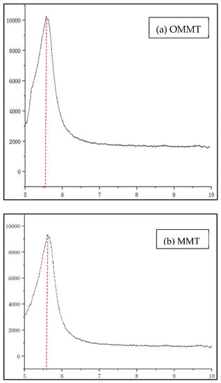 Figure 7 shows the comparison of XRD images of OMMT Figure 7a and natural MMT Figure 7b. The organic MMT intercalation was tested by the wide-angle X-ray diffractometer. The testing conditions of wide-angle X-ray diffractometer were Cu electrode, radiation voltage of 40 KV, radiation current of 40 mA, and scanning range of 1°–15°. When the intercalation agent inserted the MMT layer, causing the interlayer spacing increase, the X-ray diffraction characteristic peak of the MMT shifted to a low angle []. From the curve, it can be seen that the angle of Figure 7a became smaller than in Figure 7b. According to the Bragg formula, the interlayer spacing of MMT can be calculated to be 1.2637 nm, and the layer spacing of OMMT was 1.5462 nm.