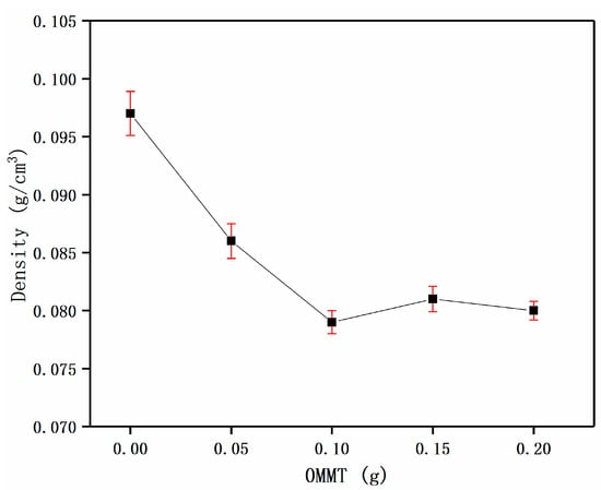 According to Figure 9, when the OMMT dosage was increased, the density gradually decreased. When the amount of addition was 0.1 g, the density of the composite foam materials reached a minimum of 0.079 g/cm3. When the dosage of OMMT was more than 0.1 g, the material density changed very little. This may be due to the content of OMMT being too high, which causes the filler to agglomerate, affecting the internal structure and properties of the foam materials.