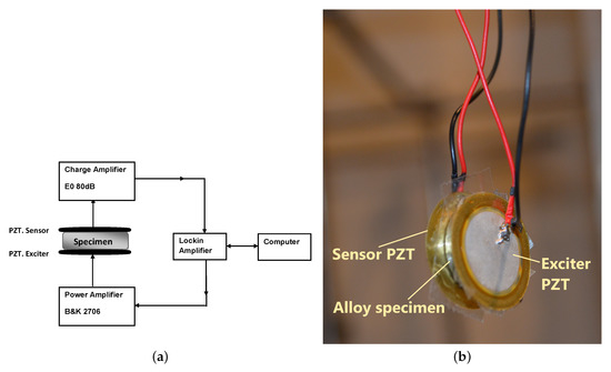 The configuration employed two thin piezoelectric transducer (PZT) discs. The PZT discs were retrieved from the resonators of the piezoelectric audio transducers used as sounders. Since their response characteristics were not known beforehand, three different discs were tested on the specimens and their responses evaluated to obtain the best choice for the experiment. They were referenced as KPEG827, KPEG110, KPEG165 (Kingstate, Taipei, Taiwan), with diameters of 25, 20, and 10 mm, respectively. Two thin PZT discs were necessary and had the same diameter. The first PZT disc was used as the exciter and the second as sensor to capture the spectral vibration response of the metal sample. The carefully polished metal-disc alloy sample was placed between the pair of PZT transducer discs. The PZT disc, Kingstate KPEG 110, 20 mm diameter, gave the best response for the tested samples. The experimental setup diagram and photograph are shown in Figure 1. A lock amplifier (Signal Recovery 7265 DSP, Oak Ridge, TN, USA) was employed to drive the exciter in discrete frequency steps. Thin double-sided adhesive tape was used to assure good contact between the two flat surfaces of the sample and the PZT. The PZT disc and sample taped to it were then suspended to ensure stressfree vibrations, i.e., without constraint (Figure 1). The adhesive tape was cut to exactly fit PZT-disc size in order to limit the impact of damping on the measurements that the tape may add. The sample was then excited using continuous harmonic stimulation, realizing a frequency sweep (frequency, 50–250 kHz in 200 Hz steps). The response was captured by the second piezoelectric disc connected to a low-noise amplifier (EO80dB, Ciprian, Grenoble, France). Rotation of the alloy-disc sample in several directions was performed to confirm the similarity of vibration response spectra, verify the isotropy of the samples, and confirm the repeatability and consistency of the obtained experimental data.