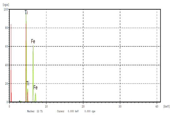 The diffractograms of Fe–Ti alloys (Figure 3a) show the existence of two Fe–Ti and Ti phases in the alloy. However, only the Fe–Ti phase is revealed with certainty. Indeed, two lines of very low intensities relative to Ti were found in this sample, whereas, in , where Ti is unambiguously highlighted. At this stage of the investigation, only the Fe–Ti phase was clearly identified in our two samples at a time. The microstructures of the and binary alloys (Figure 4a,b) showed Ti phase dendrites surrounded by interdendritic Fe–Ti phase space. This might suggest that the Fe–Ti phase appears after the Ti phase. In this case, it would probably result from a peritectic-type reaction, which would then be written as L + Ti ↔ FeTi, as predicted by the FeTi binary diagram [43]. EDS analysis (Figure 4b) revealed the chemical compositions of each of the Fe–Ti and Ti phases and confirmed their formation in the two studied alloys, even if X-ray diffraction only allowed the identification of Ti in the alloy. All of our results are in perfect agreement with what we can obtain using the Fe–Ti diagram given by Reference [44]. Moreover, our measurements of the densities of these alloys (Table 4) did not show any significant influence of the substitution of iron by titanium.