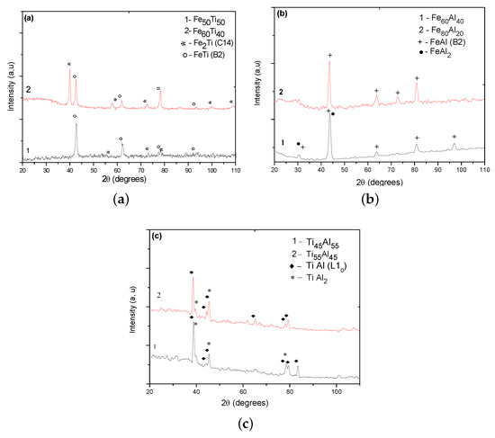 The diffractograms of the various FeTi, FeAl, and TiAl binary alloys are shown in Figure 3a–c, respectively. The different identified phases, as well as the crystalline structures and their literature references for each phase, are listed in Table 4.