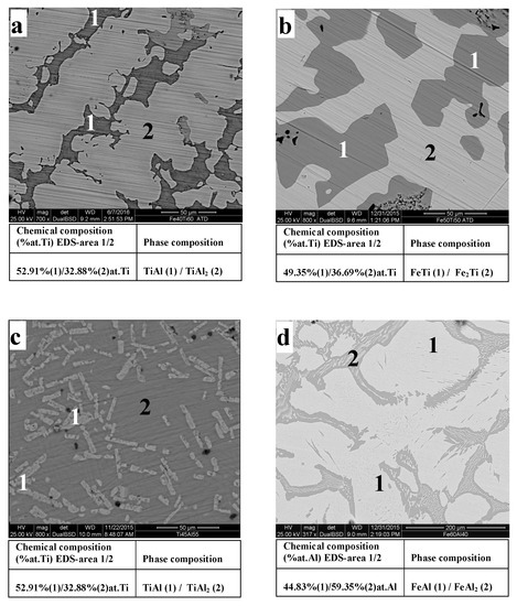 The nominal chemical compositions of the various binary alloys were verified. The effective levels of Fe, Ti, and Al were provided by EDS analysis and are listed in Table 3, in which we also reported the chemical compositions of the different observed phases in each of the studied alloys here.