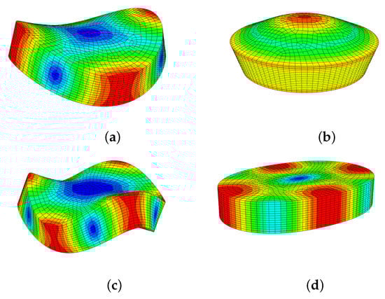 Natural vibration mode shapes of the thick discs: (a) first flexural mode (≈70 kHz—Table 4); (b) first compressional mode (≈110 kHz); (c) second flexural mode (≈134 kHz); (d) first wine-glass mode (≈165 kHz).