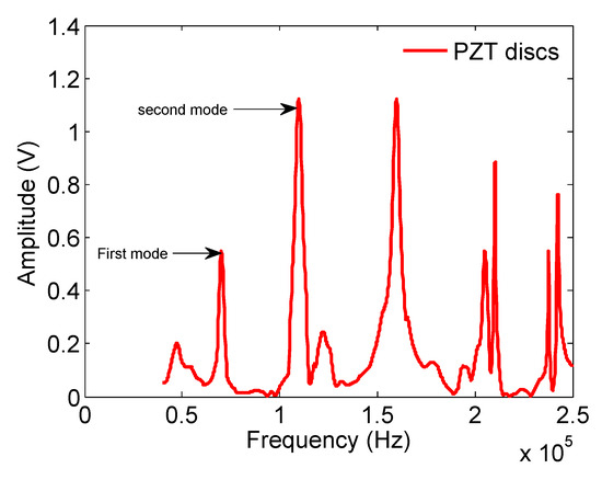 Figure 6 shows the positions of peaks corresponding to different modes of vibration, occurring by the excitation of piezoelectric crystals stuck onto the sample. The peaks appear sharp and well-defined with respect to the spectra obtained by the piezoelectric discs.