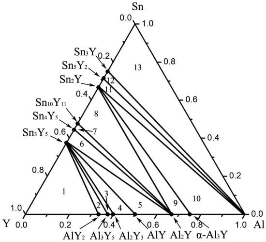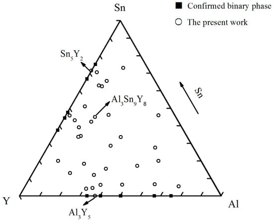Aluminum (99.9 wt.%), tin (99.9 wt.%) and yttrium (99.99 wt.%) were prepared as raw materials. The alloy compositions of all the samples are plotted in Figure 1. Some components were repeatedly designed for the ideal results. The samples (each 1.5 g) were prepared in an electric arc furnace under an argon atmosphere and a water-cooled copper crucible. In order to obtain a homogeneous composition, each sample was melted three times. For most alloys, the weight loss was generally less than 1 wt.% after being melted. All the samples were sealed in an evacuated quartz tube for homogenization treatment. The alloys which contained more than 50 at.% Sn were homogenized at 673 K for 20 days. Then, the alloys were cooled down to 473 K and maintained for 30 days. Others were kept at 873 K for 10 days and then cooled slowly to 473 K and maintained for 30 days. Finally, all the samples were quenched with ice-water.