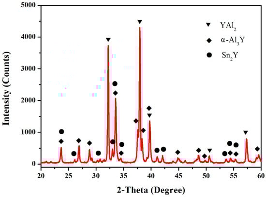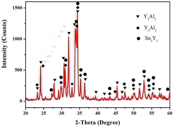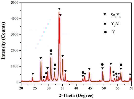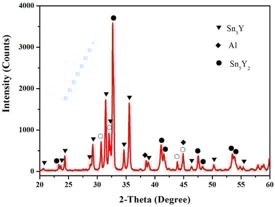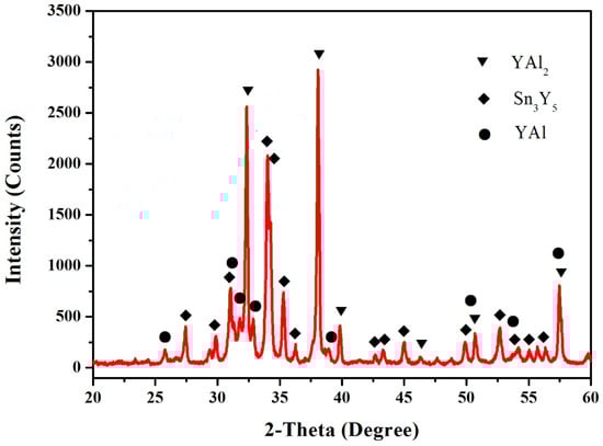 In this work, the samples (60.5 at.% Sn, 12.5 at.% Al, 27 at.% Y, 64.5 at.% Sn, 12.5 at.% Al and 23 at.% Y) were prepared to verify the existence of the Sn5Y2 phase. Figure 2 shows the X-ray powder diffraction (XRD) pattern of the sample (60.5 at.% Sn, 12.5 at.% Al and 27 at.% Y), which illustrates the existence of Sn2Y, Sn5Y2 and Al. Figure 3 shows the pattern prepared with the atomic proportion of 64.5 at.% Sn, 12.5 at.% Al and 23 at.% Y. It indicates the existence of the three phases—Sn3Y, Sn5Y2 and Al. In Figure 2 and Figure 3, the Sn phase was found. A possible reason for this is that when the Sn content is higher, it is easy to separate out tin whiskers during annealing over a longer time [16,17]. However, the XRD patterns of the samples clearly showed the existence of the Sn5Y2 phase, which was confirmed in the Al–Sn–Y ternary system at this investigated temperature.