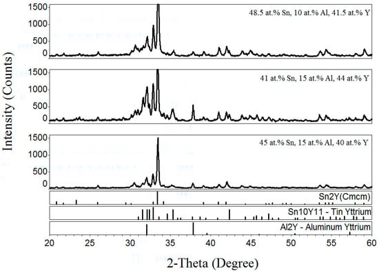 The XRD patterns of the samples (48.5 at.% Sn, 10 at.% Al, 41.5 at.% Y, 41 at.% Sn, 15 at.% Al, 44 at.% Y and 45 at.% Sn, 15 at.% Al, 40 at.% Y).