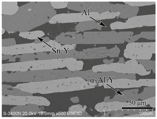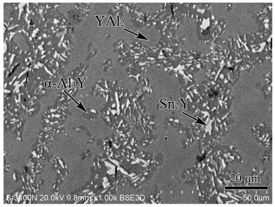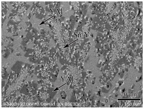 The scanning electron microscopy (SEM) micrograph of the equilibrated alloy 6.5 at.% Sn, 64 at.% Al, 29.5 at.% Y illustrating the existence of YAl2, Sn2Y and α–Al3Y.