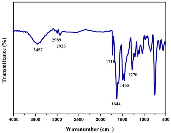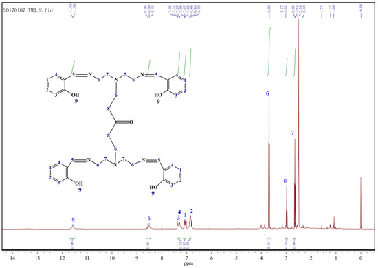The IR spectrum of MB-2 is shown in Figure 1. It is demonstrated that the stretching vibration peak attributed to the carbonyl group in salicylaldehyde does not appear at 1740 cm−1 to 1720 cm−1. The stretching vibration peak attributed to the C=N bond at 1644 cm−1 indicates that the salicylaldehyde reacts with diethylenetriamine to form a compound containing C=N and the aldehyde group disappears. The absorption peak at 3457 cm−1 and 1270 cm−1 is attributed to the stretching vibration of the O–H bond and C–O bond of phenol; the absorption peak at 2989 cm−1 and 2923 cm−1 is attributed to the stretching vibration of methyl (CH3) and methylene (CH2); the bending vibration of the N–H bond belonging to the secondary amine did not occur at 1580 cm−1 to 1490 cm−1, indicating that the hydrogen on the secondary amine reacted with acetone and formaldehyde, and the secondary amine disappeared into a tertiary amine; the absorption peak at 1718 cm−1 is attributed to the stretching vibration of C=O. IR characterization results showed that the synthesized MB-2 was the target product.