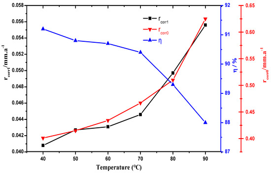 As shown in Figure 4, the increasing temperature increases the corrosion rate in the absence (rcoor0) and appearance of MBT solution (rcoor1). This is because as the temperature increases, the adsorption capacity of the corrosion inhibitor decreases, the desorption capacity increases, and the corrosion rate of the steel sheet itself increases as the temperature is higher.