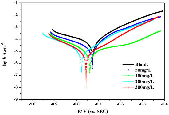 The inhibition mechanism of MBT was studied by the Tafel polarization curve method. Different concentrations (0 mg/L, 50 mg/L, 100 mg/L, 200 mg/L, 300 mg/L) of MBT were added, and the corrosive medium was a CO2 saturated solution containing 3 wt % NaCl at a temperature of 25 °C. The Tafel curve is shown in Figure 5.