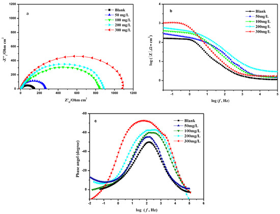 Nyquist (a), Bode-modulus (b) and Bode-phase angle (c) diagrams of N80 steel sheets with different concentrations of MBT.