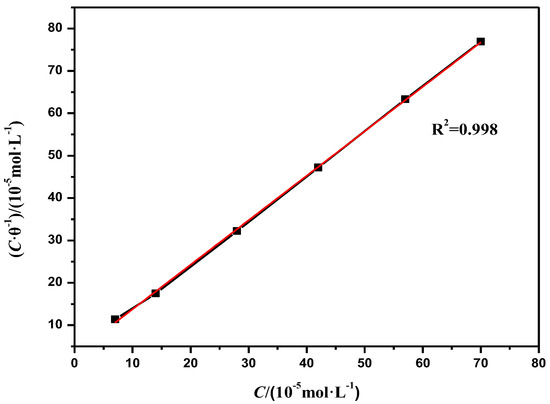The above four adsorption isotherms were used to fit the data obtained by the polarisation curve method and the impedance method. It was found to be in accordance with the Langmuir adsorption equation, and the Langmuir adsorption curve is shown in Figure 8.