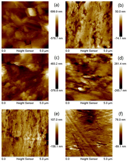 AFM plane topography of N80 steel sheet: (a) blank sample; (b) initial uncorroded sample; (c–f) is added 50 mg/L, 100 mg/L, 200 mg/L, and 300 mg/L MBT.