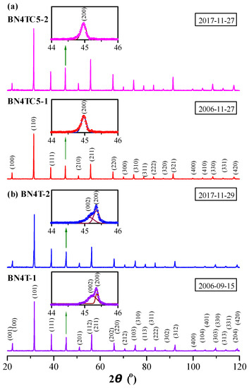 Powder XRD patterns of (a) BN4TC5 and (b) BN4T ceramics, measured in 2006 and again in 2017. The four insets on the left depict Gaussian fitting of the XRD peaks in the vicinity of 45°.