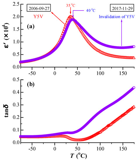 The temperature dependences of the dielectric permittivity (ε′) and the dielectric loss (tanδ) for BN4TC5 were measured in 2006 and again in 2017, as shown in Figure 2. As time went by, the permittivity maximum (ε′m) decreased by 6% and the temperature of the permittivity maximum (Tm) shifted towards a higher temperature from 35 °C in 2006 to 40 °C in 2017. The latter resulted in the invalidation of Y5V specification. Although BN4TC5 has good aging-resistant behavior in ε′, the room-temperature loss exhibited a slight increase but increased rapidly above RT.