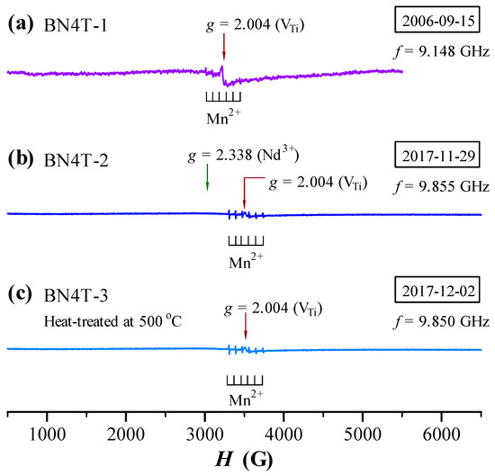 The ESR spectra of BN4TC5 measured in 2006 and 2017 are shown in Figure 4. The VTi-related signal appears in all BN4TC5 samples (Equations (3)–(5)). The intensity of the Mn2+ sextet signal of BN4TC5 is far lower than that of BN4T, which suggests that the formation of a complex in BN4TC5 [18] reduces the doping effect of in BN4T. Except for VTi- and Mn2+-related signals, a narrow g = 2.151 signal with a linewidth of 26 Gs was observed in 2017 (Figure 4b). This signal vanished at RT after the BN4TC5-2 sample was heat-treated at 500 °C (Figure 4c).