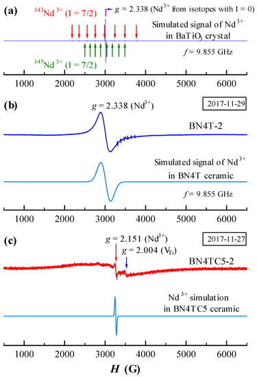 It is known that the ESR of Nd3+ in BaTiO3 crystals can be observed only in the rhombohedral phase at low temperatures, and at T ≥ 10 K, the spectrum vanishes [16]. Although the weaker rhombohedral distortions exist in the aged BN4T and BN4TC5 powders (Figure 6), the two signals at g = 2.151 and 2.338 should have nothing to do with the rhombohedral phase because of the short spin-lattice relaxation time of Nd3+ at RT. There is much controversy over the abovementioned origin of Nd3+ ESR in BN4T and BN4TC5.