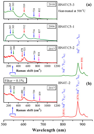 To further investigate the origin of the ESR signals, the Raman spectra of BN4T and BN4TC5 were re-measured in 2017. Similar to Er-doped BaTiO3 ceramics [14], the Raman scattering spectra and photoluminescence (PL) of Nd3+ can occur simultaneously as two distinct optical processes upon 532 nm excitation for BN4T and BN4TC5 ceramic powders, as shown in Figure 6.