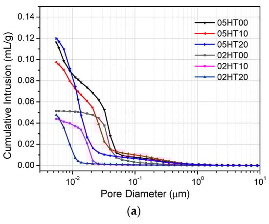 Figure 14 shows the cumulative mercury intrusion curves and pore size distribution curves for all pastes after 28 days. It can be clearly seen from Figure 14a that the cumulative pore volume of the paste with a low w/b ratio is significantly lower than that of the one with a high w/b ratio [53,54,55]. Although the cumulative pore volume in the 05HT20 paste is slightly higher than that of the control, the pore size distribution curves of the pastes to which the HT powder was added exhibit pore refinement, as shown in Figure 14b. The addition of the HT powder to the cement results in a paste with a dense microstructure and a finer pore size distribution than the OPC paste. In the analysis results of the infrared spectrum (Section 3.8), changes in the absorption peak of Si–O–Si (Si–O–Al) are also observed. This may be due to the higher degree of polymerization of C-(A)-S-H due to the pozzolanic reaction of the HT powder. This helps the microstructure of the paste to become denser [56]. Figure 15 shows the relationship between the cumulative mercury intrusion volume of the paste and the compressive strength. The correlation coefficient (R2) is 0.972. That is, as the cumulative mercury intrusion volume increases, the compressive strength decreases.