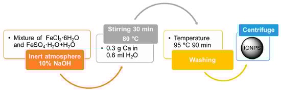 The co-precipitation method is probably the most popular method for IONP synthesis. In particular, it is widely used in biomedical applications, because of the non-toxic nature of the materials usually employed [16]. The term “co-precipitation” refers to the phenomenon by which a precipitate can carry down one or more substance—normally soluble in those particular conditions—through nucleation and grain growth. This method allows MNPs to be synthesized in an inert nitrogen atmosphere at room temperature [17]. For a schematic representation of such a synthesis technique, see Figure 2, where a typical procedure for the production of spherical IONPs is shown [18]. Through the co-precipitation synthesis, it is possible to obtain MNPs broadly distributed around a mean diameter value ranging from 5 to 40 nm (Table 1). More generally, size, shape, and magnetic properties of the resulting IONPs depend on reaction conditions such as the type of salts used [19], pH, and ionic strength [20,21].