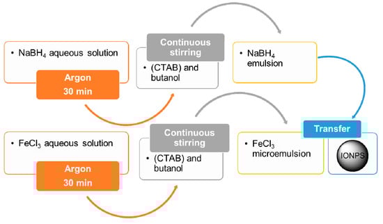 The microemulsion is a thermodynamically stable dispersion of two immiscible liquids in the presence of a surfactant, which forms a monolayer at the interface between oil and water, possibly exhibiting an ultralow interfacial tension [27]. In microemulsion, IONPs are typically synthetized by intramicellar nucleation and growth, following the standard procedure exemplified in Figure 3 [28]. The physicochemical properties of NPs prepared by such a technique essentially depend upon the choice of the surfactant. Specifically, nanoparticles result in spherical shape, nearly monodispersed, with an average diameter ranging between 10 and 25 nm [28,29]. In this context, water-in-Oil (W/O) microemulsions are called reverse micelles [30].