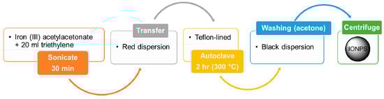 Flowchart for the synthesis of IONPs by polyol method [38]. IONPs are here prepared from a reaction between a metal acetylacetonate (precursor compound) and triethylene (diol solvent).