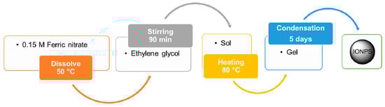 Flowchart for the synthesis of IONPs by sol-gel method [41,42]. Ferric nitrate is directly dissolved in ethylene glycol at 50 °C. The resulting sol is then dried by heating to get the gel, and finally, the IONPs of interest.