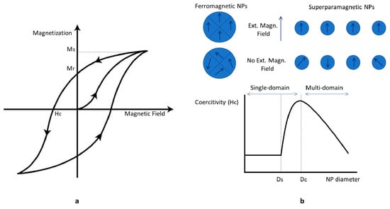 Principal features of magnetic material: (a) Hysteresis loop of ferromagnetic and ferrimagnetic materials. Critical magnetic parameters: Saturation magnetization (Ms), Coercive field (Hc), and Remnant Magnetization (Mr) are shown. (b) Magnetization behavior of ferromagnetic and superparamagnetic NPs under an external magnetic field. Domains of a ferromagnetic NP align with the applied fields. The magnetic moment of single domain superparamagnetic NPs aligns with the applied field. In the absence of an external field, ferromagnetic NPs will maintain a net magnetization, whereas superparamagnetic NPs will exhibit no net magnetization due to rapid reversal of the magnetic moment. The relationship between NP size, the magnetic domain structures, and coercive field is shown. Ds and Dc are the ‘superparamagnetism’ and ‘critical’ size threshold. Modified from Reference [77].