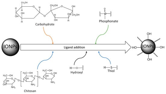 The basic principle of this method is the addition of a ligand molecule to the external surface of the IONPs without eliminating any preexisting ligand. Many functional groups such as hydroxyl, carbohydrate, thyol, and phosphonate can bind to the surface of IONPs (Figure 9) [90].