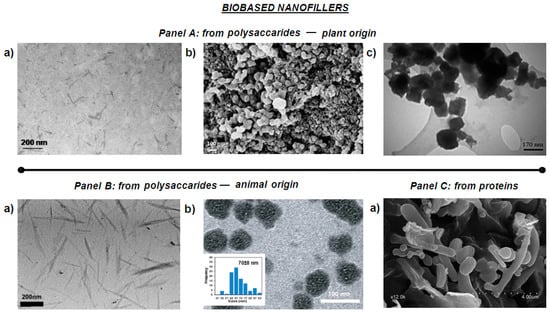 Morphological characterization of bio-based nanofillers. Panel A: Polysaccharides—plant origin: (a) Transmission Electron Microscopy (TEM) image of Cellulose Nanocrystals CNC [27]; (b) Field Emission Scanning Electron Microscopy (FESEM) image of lignin nanoparticles [34]; (c) TEM image of starch nanoparticles [35]. Panel B: Nanofillers from Polysaccharides—animal origin: (a) TEM image of Chitin nanocrystals [36], (b) TEM image of modified chitosan nanoparticles (CSNP) by poly (ethylene glycol) methyl ether methacrylate (PEGMA) (PEGMA-graft-CSNP) [37]. Panel C: From proteins: (a) Scanning Electron Microscopy (SEM) image of nanokeratin [38].