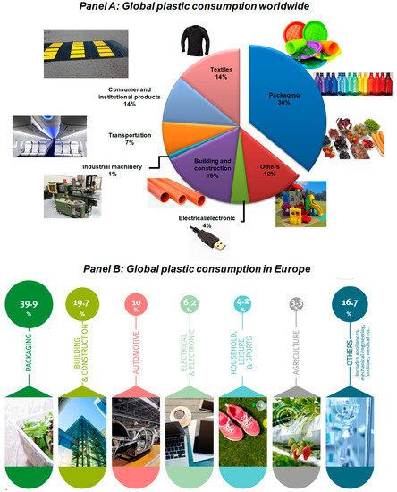 Panel A: Global worldwide plastic production and related application sectors; Panel B: Global plastic consumption in Europe [101].