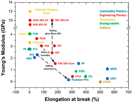 A comparison of the intrinsic properties (mechanical characteristics) of usually utilized plastic materials, engineered polymers, rubbers, bio-based polymers, thermosets, and plastic materials [127].